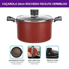 Antiaderente Resist: Limpa fácil e dura mais, reforçado com partículas minerais.Base Limpa Fácil: Não mancha, não gruda e é fácil de limpar.Tampa de vidro: Com saída de vapor.Além de contar com a qualidade da marca Rochedo, presente no Brasil há mais de 100 anos, a Caçarola Rochedo Facilita Vermelha 20cm é livre de substâncias tóxicas (PFOA), garantindo a segurança no uso dos produtos. Pode ser utilizada em fogão a gás, vitrocerâmico e elétrico, podendo também ser levada à máquina de lavar louças.