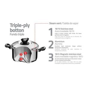 Economiza tempo e energia: o segredo está no fundo triplo (aço inox + alumínio + aço inox), que distribui o calor uniformemente, proporcionando um cozimento mais rápido. Por isso, você pode manter o fogo baixo durante todo o preparo e, assim, poupar energia.