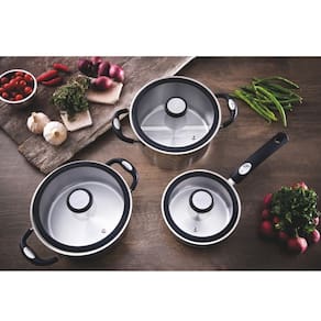 A praticidade no preparo das suas receitas vai ficar muito melhor com a Caçarola Funda Tramontina Solar Silicone em Aço Inox com Fundo Triplo 16 cm de diâmetro. É uma peça moderna que traz a tecnologia de fundo triplo (aço inox + alumínio + aço inox), característica que distribui o calor de forma uniforme, cozinhando os alimentos mais rapidamente. Além de poupar energia! Ela é uma peça funda, perfeita para as necessidades que você encontrar na cozinha. Pensando na sua segurança e bem estar, o design funcional traz cabos, alças e pegadores com revestimento em silicone antitérmico, material que torna o manuseio mais macio. Possui ainda tampa de vidro com saída de vapor e encaixe perfeito, proporcionando praticidade e um visual marcante. Versátil e fácil de limpar, é um produto que acompanha você nas tarefas diárias.