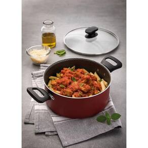 Caçarola Tramontina Loreto em Alumínio com Revestimento Interno e Externo Antiaderente Starflon T1 com Tampa e Alças Baquelite 24 cm 4,9 L Vermelha Contar com o utensílio ideal é um dos grandes segredos da culinária. A Caçarola Tramontina Loreto em Alumínio com Revestimento Interno e Externo Antiaderente Starflon T1 com Tampa e Alças Baquelite 24 cm de diâmetro 4,9 L Vermelha é perfeita para o preparo de diversas receitas. Produzida em alumínio revestido com antiaderente Starflon T1 interno e externo, possui espessura que proporciona um cozimento rápido e uniforme dos alimentos e ainda garante maior resistência à abrasão, prolongando sua vida útil em 5.000 ciclos. Seu alto poder de antiaderência faz com que os alimentos não grudem, tornando-a muito fácil de lavar. Possui tampa de vidro temperado com bordas em aço inox e alças desenvolvidas em baquelite antitérmico, que permitem o manuseio com segurança, pois não esquentam e evitam queimaduras. Uma caçarola resiste, durável e fácil de limpar, que ainda pode ser levada à máquina de lavar louças todos os dias. A Tramontina sempre pensando no melhor para você e para sua cozinha! Informações Gerais Corpo de alumínio com espessura de 1,6 mm que proporciona cozimento rápido e uniforme. Revestimento interno e externo de antiaderente Starflon T1. O único com a tecnologia T: maior poder de antiaderência; maior resistência à abrasão; maior durabilidade; mais fácil para limpar e livre de PFOA, garantindo uma resistência à abrasão acima de 5.000 ciclos segundo a Norma ABNT NBR 15321:2013. Tampa de vidro temperado com borda de aço inox. Alças de baquelite antitérmico e pegador de nylon que oferecem segurança durante o manuseio. Pode ir à máquina de lavar louças facilitando seu dia a dia.