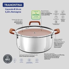 A caçarola Tramontina Romagna com revestimento cerâmico marfim, 24 centímetros de diâmetro e capacidade de 5,24 litros, é ideal para quem gosta de preparar grandes receitas com facilidade. Indicada para ensopados, massas e carnes, ela atende bem quem costuma cozinhar para a família ou receber convidados. O revestimento cerâmico contribui para um cozimento mais uniforme e facilita a limpeza. A tecnologia Biply Induction, que combina aço inox e alumínio, distribui o calor de maneira eficiente e permite o uso em todos os tipos de fogões, inclusive os de indução. As alças metálicas com proteção de silicone oferecem e conforto no manuseio. O visual moderno e a construção robusta completam o conjunto, garantindo desempenho e praticidade em todas as ocasiões.