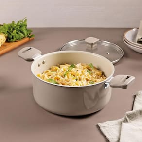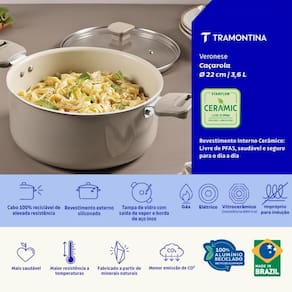 A caçarola Tramontina Veronese em alumínio reciclado com revestimento interno cerâmico e externo siliconado bege mineral 22 centímetros 3,6 litros oferece leveza e bom desempenho para as preparações do dia a dia. A estrutura em alumínio reciclado promove distribuição homogênea do calor, contribuindo para um cozimento mais eficiente. O revestimento cerâmico interno garante praticidade durante o uso. O acabamento siliconado em bege mineral adiciona um toque atual ao ambiente, resultando em uma peça funcional e adequada a diferentes rotinas na cozinha.