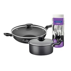 MUITO IMPORTANTE:CONFERIR PRODUTOS NO ATO DO RECEBIMENTO. NÃO ACEITAR PRODUTOS COM EMBALAGEM VIOLADA (AMASSADO, RASGADO, ABERTO, QUEBRADO, ETC), A RECUSA DEVE SER FEITA NO ATO Componentes do Kit:1 - Caçarola Turim Alumínio Antiaderente Chumbo 20cm 2,8l Ptc2 - Tramontina1 - Faqueiro Inox 30pc Ipanema Preto - Tramontina1 - Wok Com Cabo Loreto Alumínio Revestimento Antiaderente 28 cm 3,3 l Grafite - Tramontina Caçarola Turim Alumínio Antiaderente 2,8L + Faqueiro Ipanema 30pc + Wok Loreto 3,6L - Tramontina Aprimore sua experiência gastronômica com o Kit Completo Tramontina, a escolha perfeita para quem busca versatilidade no preparo e elegância na mesa. Este conjunto é ideal para cozinheiros domésticos, pois eleva o padrão de suas refeições, tornando o processo mais rápido e agradável. A Caçarola Turim e a Wok Loreto são perfeitas para pratos variados, do ensopado ao salteado, enquanto o Faqueiro Ipanema adiciona um toque de charme. O revestimento antiaderente em todas as panelas garante que os alimentos não grudem, um benefício crucial para cozinhar de forma mais saudável e com menos óleo. A Wok Loreto com seu fundo mais espesso permite um aquecimento uniforme e rápido, otimizando o tempo de cozimento. A Caçarola Turim e a Wok, ambas com revestimento antiaderente Starflon T1, proporcionam uma limpeza incrivelmente fácil, enquanto o Faqueiro Ipanema com lâminas de aço inox oferece resistência e um manuseio confortável. Todo o kit é construído com materiais de alta qualidade, oferecendo a durabilidade e a resistência necessárias para o uso diário. O design inteligente das peças, que otimiza o uso do espaço, torna sua cozinha mais organizada. Não perca a oportunidade de ter mais eficiência e beleza em sua casa. Adquira agora o Kit Tramontina e desfrute do prazer de cozinhar e servir com excelência! Especificações Caçarola:- Capacidade: 2,8L;- Alumínio com 1,2mm de espessura;- Revestimento anti-aderente;- Altura com tampa: 13,5cm;- Altura sem tampa: 9cm;- Altura interna: 8,7cm;- Diâmetro: 20cm;- Comprimento total: 32,5cm;- Garantia de 90 dias para vícios ou defeitos de fabricação;- Não utilizar em temperaturas superiores à 260C Especificações Faqueiro:- Antes da primeira utilização, lave bem as peças e seque-as.- Produto cortants e perfurantes, tenha cuidado e mantenha sempre fora de alcance das crianças.- Para maior durabilidade dos produtos, recomenda-se secar bem antes de gaurar, mesmo após lavagem em máquinas.- Para descarte dos produtos e embalagem, sega as orientações de reciclagem vigente. Conteudo:6 Faca Lâmina 11,2cm - medida 21cm6 Garfos de mesa. - medida 19cm6 Colheres de mesa. - medida 19cm6 Garfos para sobremesa. - medida 14cm6 Colheres para chá. - medida 14cm Especificações Wok:- Corpo de alumínio com espessura de 1,8 mm que proporciona cozimento rápido e uniforme.- Revestimento interno e externo de antiaderente Starflon Max.- Tampa de vidro temperado com borda de aço inox e saída de vapor.- Cabo e alça de baquelite antitérmico e pegador de nylon que oferecem segurança durante o manuseio.- Pode ir à máquina de lavar louças facilitando seu dia a dia.- Medida do Produto: 13,2cm A x 51,8cm L x 28,4cm P Cor: Cinza | É kit de fábrica: Não | Quantidade de Peças: 32 | Materiais: Alumínio | Adequado para fogão de indução: Não | Com revestimento antiaderente: Sim