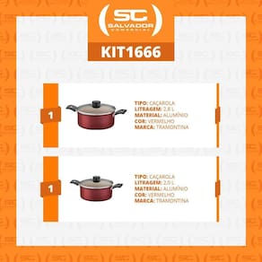 Muito importante:-- conferir produtos no ato do recebimento. Não aceitar produtos com embalagem violada amassado, rasgado, aberto, quebrado, etc , a recusa deve ser feita no ato.Jogo de caçarolas turim 2 peças alumínio antiaderente 18cm e 20cm vermelho ptv - tramontinacomponentes do kit:- 1 caçarola turim alumínio antiaderente vermelho 18cm 2,0l ptv1 - tramontina 20261718- 1 caçarola turim alumínio antiaderente vermelho 20cm 2,8l ptv2 - tramontina 20261720caçarola turim alumínio antiaderente vermelho 18cm 2,0l ptv1 - tramontina 20261718:a caçarola tramontina turim em alumínio com revestimento interno e externo em antiaderente starflon max vermelha 18 centímetros de diâmetro 2 litros é indispensável para o preparo das suas refeições. Produzida em alumínio com espessura de 1,2 milímetros e revestimento interno e externo de antiaderente starflon max, ela proporciona o cozimento rápido e uniforme dos alimentos, evita que eles grudem em sua superfície, é fácil de limpar, mais durável e não prejudicial à saúde. Suas alças em baquelite antitérmico, oferecem maior segurança durante o manuseio, pois não aquecem. Ela é muito prática e pode ir à máquina de lavar louças, facilitando seu dia a dia.- capacidade: 2l;- alumínio com 1,2mm de espessura;- revestimento anti-aderente;- altura com tampa: 12,5cm;- altura sem tampa: 8cm;- altura interna: 7,8cm;- diâmetro: 18cm;- comprimento total: 30,5cm.Caçarola turim alumínio antiaderente vermelho 20cm 2,8l ptv2 - tramontina 20261720:leve o melhor para sua cozinha com a caçarola tramontina turim em alumínio com revestimento interno e externo em antiaderente starflon max vermelha 20 centímetros de diâmetro 2,8 litros. É um produto indispensável para o preparo das suas refeições, pois é produzida em alumínio com 1,2 milímetros de espessura e revestimento interno e externo em antiaderente starflon max, características que evitam que os alimentos grudem em sua superfície, a tornam superfácil de limpar e não prejudicial a sua saúde. As alças em baquelite antitérmico, não aquecem e proporcionam um manuseio muito mais confortável e seguro.- capacidade: 2,8l;- alumínio com 1,2mm de espessura;- revestimento anti-aderente;- altura com tampa: 13,5cm;- altura sem tampa: 9cm;- altura interna: 8,7cm;- diâmetro: 20cm;- comprimento total: 32,5cm.Tamanho da embalagem: 20cm a x 36cm l x 24cm p;peso bruto: 1,58kg.