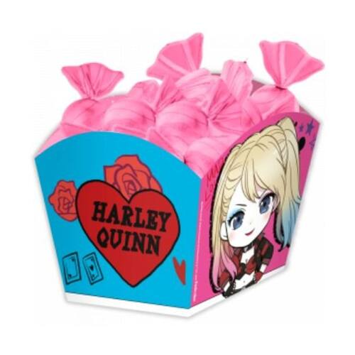 Cachepot Arlequina C/8 Festcolor. Inteligente, destemida e muito habilidosa, é a parceira fiel de Coringa, Arlequina. O tema da heroína imprevisível e de personalidade vibrante vai te garantir uma festa com muita diversão e estilo! O cachepot pode ser utilizado como centro de mesa (com balões e guloseimas), e também para servir pipoca, biscoito, docinho e salgadinho.