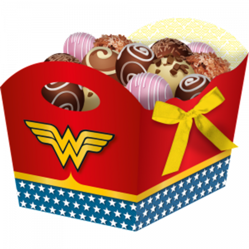 Cachepot Mulher Maravilha C/8 Festcolor. A heroína mais destemida e magnifica dos últimos tempos, agora na sua festa! O cachepot pode ser utilizado como centro de mesa (com balões e guloseimas), e também para servir pipoca, biscoito, docinho e salgadinho.
