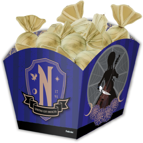 Cachepot Wandinha C/8 Festcolor. Amiga inseparável de sua "mãozinha", curiosa, autoconfiante e muito determinada, essa é a Wandinha! Um tema com a mistura perfeita de escuridão e mistério, que irão impressionar seus convidados! O cachepot pode ser utilizado como centro de mesa (com balões e guloseimas), e também para servir pipoca, biscoito, docinho e salgadinho.