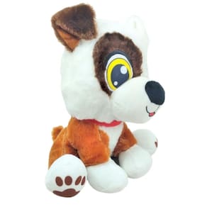 Cachorro pelúcia bicolor 25 cm altura sentado fofinho Descrição do produto