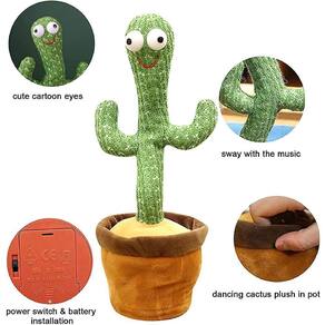 O cacto dança e fala vem com uma função de gravação para repetir qualquer linguagem que você fala, de uma maneira engraçada, ele é ótimo para educação dos filhos e diversão da família, é um grande presente para toda a criançada.São várias canções felizes e danças animadas. Ele é interativo e perfeito para todas as idades, auxiliando nas primeiras palavras do bebe, diverte as crianças e adultos. São vários modelos e são enviados .ESPECIFICAÇÕES:- Alimentação: via USB- Pode tocar, dançar, mover, girar e acender luzes- Material: Plush Macio, confortável, e não toxico Medidas Aproximadas:Altura: 30cmLargura: 6,5cmProfundidade: 12cmCódigo: 079922Dimensões aprox. Da embalagem em cm: 13x13x32Peso liq. Aproximado do produto na embalagem: 287g Referência do Modelo: ZW-1264Certificado Inmetro: SimConteúdo da Embalagem: 01 Cacto que dançaComposição/material: Plush, tecido, plástico e componentes eletrônicosIdade recomendada: a partir de 3 anos : 90 dias contra defeitos de fabricação pelo fabricanteImagens meramente ilustrativas. As cores, modelos e tonalidades podem variar.
