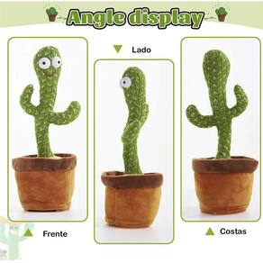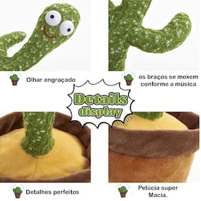 Cacto de pelúcia com seu olhar muito engraçado ele dança, gira, mexe os braços, toca música, acende luzes e repete sua fala. Tecido de malha com efeito tridimensional, macio, confortável, seguro e funcional Ele imita qualquer palavra que disser perto dele, possui luzes coloridas que chamam toda a atenção das crianças. Toca 120 canções diferentes.