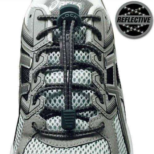 O cadarço elástico Cinza da Lock Laces é feito com material refletivo 3M para ajudar você a se manter visível em lugares com pouca incidência de luz.
