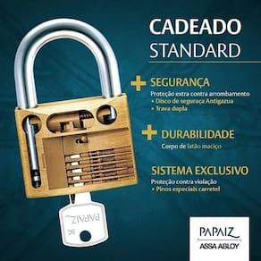O Cadeado Standard Papaiz, é produzido em latão maciço , haste de aço cementada e cromada, possui 2 chaves em latão niqueladas. Para conservação melhor de o produto lubrificar com óleo mineral quando necessário.