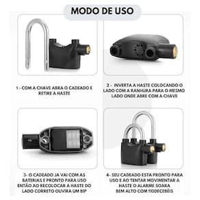 Cadeado com alarme antifurto prova de água lock Cadeado com Alarme Sonoro. Ideal para Proteção de Portões, Garagens, Motocicletas e Mais Características Principais: Alarme de Alta Potência: Alarme sonoro de 110dB que dispara com movimento ou impacto, proporcionando segurança adicional. Material de Alta Resistência: Manilha em aço fundido de 10 mm e corpo em liga de alumínio para resistência a corrosão e durabilidade. Versatilidade: Pode ser com ou sem a função de alarme, adaptando-se às suas necessidades. Funcionamento Inteligente: 1 toque curto para armar 3 toques curtos para informar que irá disparar o alarme se não parar de mexer ou forçar o cadeado vai disparar a sirene de 110 decibéis. O alarme desarma sozinho, caso não mexam mais com o cadeado. Se o intruso continuar mexendo no cadeado ele continua disparando. Alarme de 2 tons Bi P De Aviso e Sirene de 110 DB. Não depende de instalação pois funciona com baterias - acompanha 6 baterias reserva e 6 baterias já instaladas no produto baterias de longa duração. Lembrando o cadeado vai desarmado, para ativar basta retirar a alça do cadeado e inverter a posição da haste Especificações Técnicas: Resistente à Água e ao Tempo: Ideal para uso externo em diversas condições climáticas. Sensor Dual: Detecta choque e movimento, aumentando a segurança. Acompanha Baterias e Chaves: 12 baterias LR44 6 instaladas e 6 reservas e 3 chaves de corte a laser exclusivas. Dimensões e Peso: Tamanho total - 12.5cm x 9cm x 3cm; Fechadura - 8cm x 6cm x 1cm; Peso - 330g. Itens Inclusos: 1 Cadeado com Alarme Sonoro. 1 Kit Baterias 3 Chaves Marca: Não Informado Ean: 7895312496442