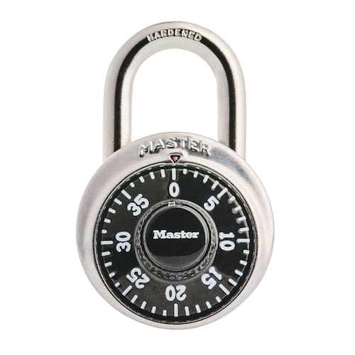 - A trava combinada é construída com um corpo de metal, tampa de aço inoxidável, manilha de aço temperado e mecanismo de travamento anti-calço para maior resistência e segurança