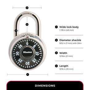 - Corpo de trava de 1-7/8 pol. (48 mm) de largura; manilha de 9/32 pol. (7 mm) de diâmetro com 3/4 pol. (19 mm) de comprimento e 13/16 pol. (21 mm) de largura
