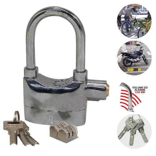 alarme de alta potência: dispara automaticamente quando o cadeado é ou movimentado, atuando como um poderoso dissuasor. Fácil de usar: sistema de travamento seguro e eficiente, com 3 chaves de segurança. Resistente e durável: projetado especificamente para atender às necessidades de segurança das motos, com design robusto e construção de alta qualidade. Revestimento resistente à corrosão: proporciona durabilidade mesmo em condições adversas. Versatilidade de uso: o cadeado pode ser utilizado como um cadeado comum, sem ativar o alarme. Especificações técnicas: