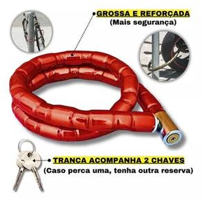 Cadeado indicado para motocicletas e bicicletas com 100 cm de perímetro, corpo flexível composto de anéis de aço articulados com espessura 22 mm. revestimento emborrachado e fechadura em metal zincado. indicado para amarração antifurto de motocicletas e bicicletas. Marca: Não Informado Ean: 7903413831144