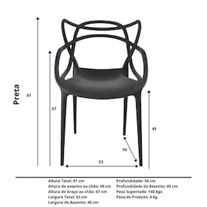 Cadeira Allegra Masters Preta Devido ao seu design ergonômico, a Cadeira Allegra se destaca entre as demais por acomodar de forma confortável as curvas naturais do corpo tornando esse modelo extremamente aconchegante. Ideal para sua sala de jantar, de estar, home office, varandas e sacadas, fica perfeita também em projetos de área gourmet, quiosques e ambientes abertos pois a sua proteção UV permite que ela fique exposta ao sol sem perder a cor ou se deteriorar. Devido à sua versatilidade ela também se adequa perfeitamente à ambientes comerciais, seja na sala de reuniões da empresa, em escritórios, clínicas, consultórios, hotéis de luxo ou qualquer estabelecimento que busque por um design diferenciado e com toques de requinte. Fabricada em polipropileno com fibra de vidro, sua resistência é incomparável, podendo suportar até 140kg, comprovada pelo selo de certificação de qualidade do INMETRO. Leve e dinâmica, a Cadeira Allegra é de fácil transporte e manuseio, já chega no seu endereço cuidadosamente embalada e pronta para uso, não necessita montagem, dispensando o serviço de montador profissional. Empilhável, ela vai facilitar o seu dia durante a organização do ambiente e durante a limpeza. Para limpar sua Cadeira Allegra é muito simples: basta usar um pano umedecido com sabão neutro e pronto! Seu material facilita a limpeza, não mancha e garante durabilidade e praticidade para o seu dia a dia. Não nos responsabilizamos por eventuais danos ao manusear o material em elevadores, transporte pela escada ou elevações pelo lado de fora de prédios. É indispensável que, no endereço indicado, haja um representante legal (comprador ou pessoa anteriormente indicada), maior de 18 anos, e portando documento de identificação para receber, conferir a mercadoria e assinar o protocolo. As cores do produto podem variar entre a imagem de exibição e o item físico. Características da Cadeira Allegra - Design descontraído e versátil - Ergonômica - Se encaixa em qualquer ambiente da sua casa - Fica bem em ambiente comercial - Feita em propileno e fibra de vidro - Proteção UV: pode ficar exposta ao sol - Fácil de transportar e manusear - Resistente e durável - Certificada pelo INMETRO - Empilhável - Suporta 140Kg - Praticidade na limpeza e manutenção Medidas da Cadeira Allegra - Altura: 81 cm - Altura do assento: 49 cm - Altura do braço ao chão: 67 cm - Largura: 51 cm - Profundidade: 56 cm - Peso suportado: 140 kg - Peso do Produto: 4 kg Indicações de Uso: - Não utilizar produtos químicos e abrasivos para limpeza - Limpar com pano umedecido e sabão neutro para melhor conservação - Não sentar sobre as cadeiras se estiverem empilhadas