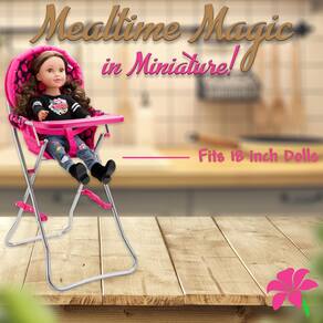 - Cadeira alta de boneca de 45,7 cm: a cadeira alta de boneca inclui uma bandeja, um assento confortável e um cinto de segurança para manter suas bonecas seguras enquanto elas desfrutam de suas refeições. É o acessório perfeito para alimentar e nutrir suas bonecas.