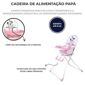 Cadeira alta de alimentação infantil papá rosa coala Cadeira alta de alimentação infantil rosa coala Código: hc15d Com um revestimento plastificado, a papá garante uma limpeza rápida e fácil, tornando o momento das refeições mais tranquilo para todos. Equipada com proteção lateral e um cinto de segurança de cinco pontos, a papá oferece um ambiente seguro e confortável para o seu bebê durante as refeições. Com uma estrutura em aço e pintura epóxi de linha premium, a papá combina durabilidade com um design elegante, garantindo que ela se adapte perfeitamente a qualquer ambiente. A bandeja com porta-copos oferece espaço para os utensílios essenciais do seu bebê, enquanto o apoio de pés com três posições de ajuste garante conforto adicional durante as refeições. Com uma trava de segurança, a papá oferece tranquilidade aos pais, garantindo que a cadeira permaneça estável durante o uso. A papá é projetada para facilitar o transporte e o armazenamento, sendo fácil de desmontar quando necessário. Principais características: Possui revestimento plastificado de fácil limpeza; Proteção lateral; Possui cinto de segurança 5 pontos Estrutura em aço, pintura epóxi linha premium Bandeja com porta-copos Apoio de pés com 3 posições de ajuste Trava de segurança Fácil desmontagem Capacidade máxima 15 kg Registro do produto no inmetro: 003348/2023 Dimensões: - medida da cadeira aberta: 100x43x74 axlxp : 12 meses direto com o fabricante Marca: Não Informado