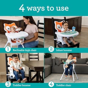 Infantino Cadeira alta conversível 4 em 1 Grow-with-Me, tema raposa, design que economiza espaço, cadeira para bebês e crianças de 3 a 36 meses - 4 produtos em 1: Cadeira alta reclinável com bandeja suporta bebês de 6 meses ou mais para alimentação. Assento infantil com bandeja para suporte vertical. Assento infantil sem bandeja para uso na mesa. A adorável cadeira infantil pode ser usada em qualquer cômodo! Um cinto de segurança ajustável de 5 pontos prende o bebê ao assento enquanto ele cresce - Fácil de limpar: a bandeja removível e o acolchoamento de espuma de baixa densidade são fáceis de limpar. O tapete de refeição removível sem BPA é seguro para lava-louças na prateleira superior. Limpe a cadeira com sabão e água após cada uso para manter a limpeza - Tamanho certo: as seções práticas e divididas de alimentos e lanches no tapete de refeição elevaram paredes que têm o tamanho perfeito para que os dedos pequenos possam facilmente pegar lanches - Design de crescimento comigo: economize dinheiro e espaço com o design desta cadeira alta que se ajusta para bebês de 6 meses a crianças de até 15 kg. Use-o no modo cadeira reclinável para alimentação com mamadeira, modo booster infantil para explorar alimentos sólidos, modo booster infantil para comer na "mesa grande" ou modo de cadeira infantil para quando seu filho só precisa de um lugar para sentar - Projetado com amor: na Infantino, amamos bebês, adoramos crianças e admiramos suas mães e pais. Trabalhamos duro para criar produtos que orientam o desenvolvimento e trazem alegria à medida que o bebê cresce. Pais felizes e crianças são o que queremos