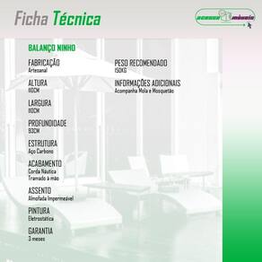 Com design moderno, acabamento impecavel e uma capacidade de ate 120 kg, ele e perfeito para momentos relaxantes e divertidos. Alem disso, acompanha uma mola para maior conforto e um mosquetao para facilitar a instalacao. Por se tratar de um produto artesanal, voce pode ter a certeza de estar adquirindo um item unico e de alta qualidade seja em um jardim, varanda ou espaco de lazer, nosso balanco suspenso vai encantar voce e seus convidados.