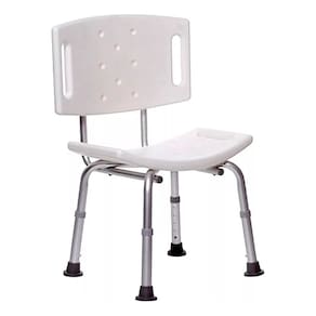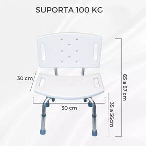 Banqueta Cadeira de Banho com Encosto Supermedy   Banco para banho com corpo de alumínio anodizado, e encosto ergonômico. O assento possui encaixe de mãos com aberturas para escoar a água. Sua regulagem de altura é facilitada com pino click. É ideal para pessoas que necessitam de segurança no banho.   Características - Segurança no banho e fácil higienização; - Encosto ergonômico para as costas; - Ajustável regulagem de altura através de engate rápido pino click; - Segurança: encaixe de mão no assento; - Textura no assento para maior aderência; - Ergonomia: Assento curvo para melhor postura e encaixe; - Ponteiras de borracha com ventosas para melhor fixação no chão; - Assento com aberturas para escoar água; - Alta resistência a umidade; - Suporta até 100 Kg;