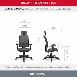Precisando do Laudo NR-17 A gente entrega o suporte completo que você merece. Esse é um de nossos produtos que possui laudo ergonômico NR-17, essencial para comprovar que os itens atendem às normas de ergonomia exigidas pelo Ministério do Trabalho. E é somente nós solicitar após a compra que lhe enviamos. Diferente de muitos vendedores que não oferecem esse suporte, aqui você tem total segurança para equipar seu escritório com produtos certificados e evitar dores de cabeça. Por que esse laudo é tão importante Empresas podem ser fiscalizadas a qualquer momento, e a ausência do laudo pode gerar notificações, multas ou até mesmo processos trabalhistas vindo de colaboradores. Ter esse documento em mãos é um cuidado que demonstra seriedade e responsabilidade com a saúde dos colaboradores. Conte conosco para entregar mais que produtos - entregamos segurança, conformidade e tranquilidade. A harmonia perfeita entre versatilidade e leveza com um impressionante toque de elegância é o que nos encanta ao observar a Brizza Presidente. Toda a concepção da cadeira foi cuidadosamente pensada, a começar pelos rodízios. Nesta área as opções foram desenvolvidas justamente para se adaptarem aos diferentes tipos de piso, desde os mais irregulares até os mais lisos. Palavras de Vendedor: Modelo muito ergonômico e confortável, uma linha muito antiga portanto já provou para o mercado sua qualidade, diferente de um produto que é lançamento de poucos anos de venda. Esse modelo possui as regulagens de altura e inclinação do encosto que trazem uma maior ergonômia e adaptação para diversas biotipos e estaturas. Essa variação com base cromada que é muito bonita e chamativa, realmente quem pode gastar um pouco mais mas nem tanto para adquirir uma cadeira com base aluminio, recomendaria essa, mas realmente é somente estética, em relação a durabilidade os outros modelos de base não deixam nada a desejar. Como o modelo preto. Produto nacional fabricado pela Plaxmetal Peso Max. Recomendado: 135 kg Classificação: Giratória; Alta com apoio; Com base cromada Modelo: Nacional Base: Cromada Regulagem de Altura: Sim, com pistão classe 4. Com rodízios: Sim, com rodízios em PU anti-risco Com sapatas: Não se Aplica Mecanismo: backplax com regulagem de altura e inclinação do encosto. Regulagem de altura do Encosto: Sim Braços: Braços Reguláveis 3D em Polipropileno. não é mácio Medidas da Cadeira A x L x C : Medidas expressas na última foto do anuncio. Tipo de Revestimento: Sintético Preto : de 05 Cinco anos, inclusos os 90 dias de legal, contra defeitos de fabricação na estrutura metálica e peças plasticas com função estrutural, coluna á gás possui 2 anos de sendo classe 4, e demais componentes possuem de 1 ano. a é concedida considerando uso por 8 horas de trabalho/dia por usuário com peso máximo de 110kg e respeitando totalmente as recomendações de uso, limpeza, conservação e segurança. Marca: Não Informado Ean: 7894204214133