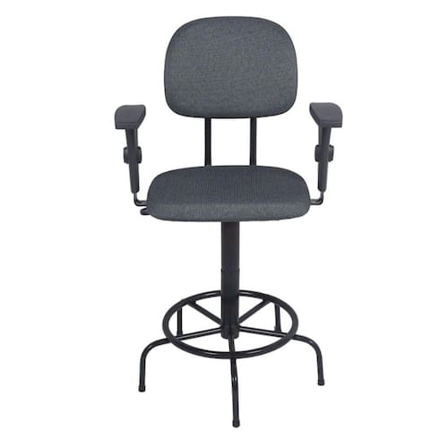 Cadeira caixa alta com braço - L duplo - regulagem de altura - base de ferro fixa tecido cinza/preto Cadeira secretaria caixa alta - braço com regulagem - apoio para os pés - estrela de ferro - espuma injetada - madeira reflorestada - bordas em pvc flexivel - revestido em tecido j. Serrano anti-chama - prolongador de altura