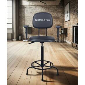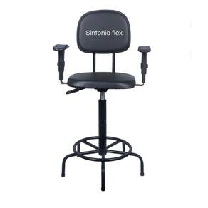 Cadeira caixa alta com braço - L duplo - regulagem de altura - base de ferro fixa corano preto Cadeira secretaria caixa alta - braço com regulagem - apoio para os pés - estrela de ferro - espuma injetada - madeira reflorestada - bordas em pvc flexivel - revestido em corano - prolongador de altura
