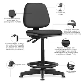 Com regulagem de altura do assento e inclinação do encosto via sistema Revolution (mecanismo de contato permanente).
