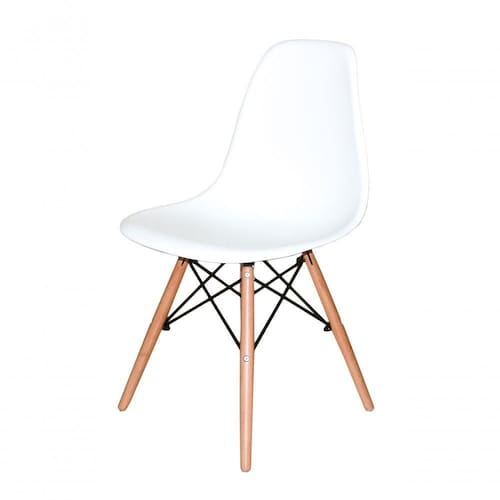 Cadeira Charles Eames Eiffel Madeira Branca Cadeira Eiffel Eames Base Madeira A CADEIRA CHARLES EAMES EIFFEL foi criada nos anos 50, é vencedora do Museu de Nova York da concorrência Design de Mobiliário Low-Cost Arte Moderna Internacional. Sua base é em MADEIRA no formato de uma torre faz com que o ambiente não fique sobrecarregado. Adequa-se perfeitamente para compor conjunto de mesa de jantar ou qualquer outro ambiente em sua casa ou escritório. Ideal para receber amigos e familiares com um toque de elegância e charme. As pernas da cadeira são em madeira e fios de aço preto no qual garantem estabilidade à cadeira.