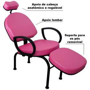 Cadeira Conforty para Maquiagem Cílios Sobrancelha unhas Para execução de vários procedimentos de estética e beleza, a For-ty Store lançou a Cadeira Multiuso para Procedimentos modelo Conforty. Com ela, você pode fazer serviços como maquiagem, cílios, sobrancelha, limpeza de pele, unhas, e demais procedimentos, mantendo máximo de conforto para cliente. É uma cadeira robusta, que tem inclinação e apoios corretos para variados serviços. Características: - Cor do estofado: Pink em Tecido Sintético Facto, o tecido Facto é resistente ao uso de Álcool 70 para limpeza e higienização. - Encosto de cabeça anatômico, com altura ajustável, que apoia a nuca, dando conforto para o cliente e a firmeza que o profissional precisa - Apoio lombar, para que seu cliente se sinta confortável pelo tempo que necessite para execução do procedimento - Apoio de pernas: além de deixar seu cliente relaxado, tem a altura certa para procedimentos nos pés e unhas dos pés. Pode ser removível - Apoio de braços em P.U., material resistente e com toque macio Medidas montada: 130cm x 63cm x 85cm Sem o apoio de pé: 90cm x 63cm x 85cm Medidas internas no assento: largura 49cm x Profundidade 48 cm Medidas internas do encosto: Largura 47,5cm x Altura 42cm Medida do assento ao chão: Parte incial do encosto 42cm x Parte final próximo ao apoio de pés 52cm Alturas do apoio de pés: Mínima 39,5 cm e Máxima 49 cm Medida da caixa: 68cm x 53cm x 54cmMedidas aproximadas, podendo haver pequenas variaçõesSuporta até 160Kg distribuídos Peso 19kg