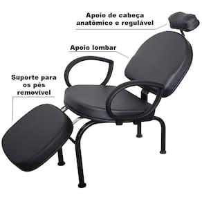 Características: - Encosto de cabeça anatômico, com altura ajustável, que apoia a nuca, dando conforto para o cliente e a firmeza que o profissional precisa - Apoio lombar, para que seu cliente se sinta confortável pelo tempo que necessite para execução do procedimento - Apoio de pernas: além de deixar seu cliente relaxado, tem a altura certa para procedimentos nos pés e unhas dos pés. Pode ser removível - Apoio de braços em P.U., material resistente e com toque macio