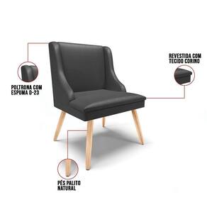 Para os fãs de decoração temos a cadeira Liz, linda e extremamente confortável, ela não passa despercebida por ninguém, se tornando a protagonista de qualquer ambiente, marcando presença em qualquer cômodo, deixando o ambiente mais completo e muito mais agradável. Com estrutura ecologicamente correta de madeira de eucalipto e pinus, oferece durabilidade e qualidade ao móvel, seu estofamento é com espuma de densidade D-23, revestido em tecido em Corino no tom Preto, que oferece muito conforto e resistência ao sentar, com aquela sensação de maciez e bem-estar. Deixe sua decoração muito mais charmosa com a cadeira Liz, aproveite e escolha a sua!