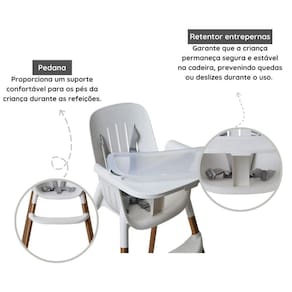 Características Técnicas: Para crianças de 6 a 36 meses, até 15 kg Bandeja removível Design moderno Pedana Cinto de segurança de 5 pontos Retentor entrepernas Pés antiderrapantes Sobre bandeja removível Estrutura tubular garante estabilidade, além de permitir o empilhamento Desmontável