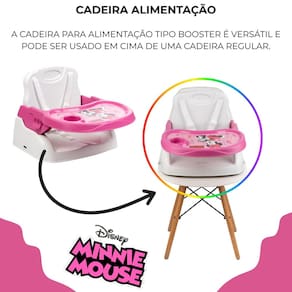 Cadeira de alimentação portátil bandeja ajustável booster até 15 kg disney minnie A cadeira para alimentação tipo booster é versátil e pode ser em cima de uma cadeira regular. Leve e facilmente desmontável, pode ser transportada para qualquer sem dificuldades. Muito segura, está equipada com cinto de segurança de 5 pontos. Idade recomendada: 6 meses + Peso suportado: até 15 kg Cinto de segurança de 5 pontos Bandeja removível e ajustável em 3 posições Adaptável a cadeiras Desmontável, fácil de transportar Material: plástico e aço Registro inmetro: 001 486/2022 de 3 meses direto com o fabricante Marca: Não Informado