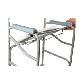 Incluso: Cadeira de Banho D40 Dobrada, Assento Sanitário com Barra, Estofamento do Encosto, Suporte do Encosto, Apoio de Pé e Manual