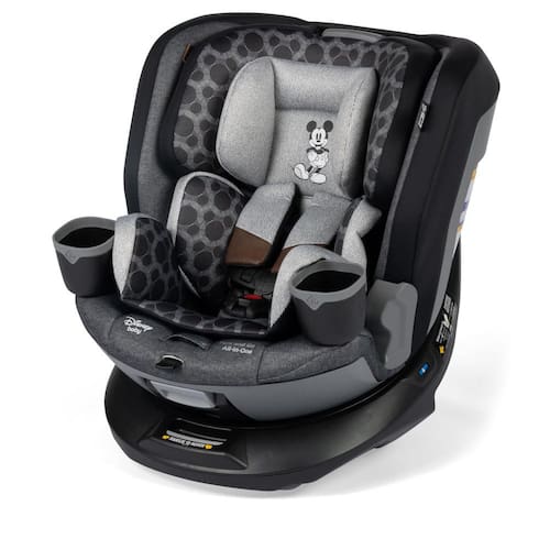 O assento de carro conversível AllinOne giratório 360 da Disney Baby Turn and Go inclui um braço de travamento do cinto de veículo integrado que ajuda a garantir um ajuste seguro durante a instalação. Possui encosto de cabeça com 10 posições e arnês ajustáveis para cada estágio de crescimento da criança, reclinação em 5 posições, inserções infantis de pelúcia e tecidos premium. A almofada de assento é lavável à máquina e segura para secar, enquanto os dois porta-copos removíveis podem ser lavados na máquina de lavar louça, oferecendo praticidade para os pais.