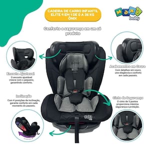 Cadeira de Carro Infantil Elite 0-36Kg Ônix Cinza Maxi Baby A cadeira Elite da Maxi Baby é uma cadeira para auto completa que irá atender todas as fases do seu filho, desde o nascimento até aproximadamente os 10 anos de idade, onde ele já estará pronto para o assento do veículo, não sendo necessário mais nenhuma cadeira de elevação. Possuí almofada removível para fácil lavagem, cinto de segurança de 5 pontos com ajuste de altura para os ombros em até 2 posições, reclinável em até 4 posições. Durante os primeiros meses do bebê, a cadeira Elite é instalada contra o movimento podendo estar nessa posição até 10kgs. Após 10kgs ela deverá ser fixada a favor do movimento e possui 4 opções de recline para melhor conforto da criança. Suas 4 posições de inclinação oferecem conforto para os passeios mais curtos ou as viagens mais longas, fazendo com que além de uma companheira da criança por toda a sua infância, seja uma grande aliada dos pais. Essa cadeirinha infantil é adequada para uso nos veículos ajustados com cintos de segurança retráteis de 3 pontos conta com o apoio de cabeça ajustável, almofada redutora de cabeça e costas, protetores de ombros e fivela com revestimento acolchoado e lavável. Produto certificado pelo INMETRO para maior segurança e conforto das crianças Principais Características: - Grupo: 0, 1, 2, 3 De 0 a 36Kg - Idade recomendada: A partir do Nascimento - No Grupo 0 Até 10kg - Deve ser instalada de costas para o movimento, fixada ao veículo com o cinto de segurança do veículo e a criança deve utilizar o cinto de segurança da própria cadeirinha - No Grupo 1 9 à 18kg - Deve ser fixada ao veículo com o cinto de segurança do veículo e a criança deve utilizar o cinto de segurança da própria cadeirinha - No Grupo 2 e 3 15 à 36kg - Deve ser utilizar sem os seus cintos de segurança da cadeira e o cinto de segurança do veículo deve prender a criança e a cadeirinha ao mesmo tempo. Utilização do cinto de segurança do veículo obrigatória a partir dos 18Kg e alternativamente à partir dos 15kgs. - Reclina em até 4 posições - Apoio de cabeça ajustável - Cinto de segurança de 5 pontos - 2 Ajustes de Ombros - Ajustador do cinto de segurança nos ombros - Dispositivo de Retenção com apoio de braço - Almofada redutora de costas e cabeça. - Protetores de Ombros e Fivela - Revestimento Acolchoado removível para lavar - Leve inclinação na base - Adequada para uso nos veículos ajustados com cintos de segurança retráteis de 3 pontos - Produto certificado pelo INMETRO Especificações Técnicas: - Conteúdo da Embalagem: 1 Cadeira de Carro + Manual de Instruções - Dimensões do Produto LxCxH : 48,0 x 53,0 x 60,0 cm aprox - Peso: 7,4 kg - Material/Composição: Plástico, Espuma, Poliuretano, Tecido - : 12 meses Contra Defeito de Fabricação Pelo Fabricante - Produto Certificado pelo INMETRO nº 009889/2022 - Referência do Fabricante: 21776 - EAN: 7899403217763 - Marca: Maxi Baby imagens meramente ilustrativas, as cores e estampas podem variar de acordo com o lote do fabricante. Marca: Não Informado Ean: 7899403217763