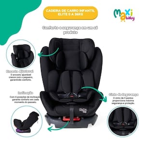 A cadeira Elite da Maxi Baby é uma cadeira para auto completa que irá atender todas as fases do seu filho, desde o nascimento até aproximadamente os 10 anos de idade, onde ele já estará pronto para o assento do veículo, não sendo necessário mais nenhuma cadeira de elevação.