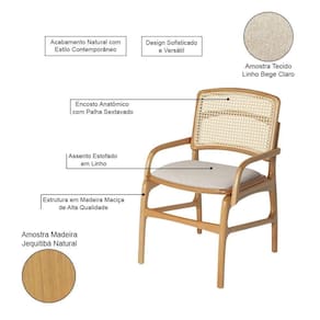 AS IMAGENS SÃO MERAMENTE ILUSTRATIVAS E PODEM SOFRER VARIAÇÕES DE COR E PEQUENOS DETALHES DE ACORDO COM O SEU MONITOR, ILUMINAÇÃO DO AMBIENTE E ATÉ MESMO A SUA PERCEPÇÃO VISUAL.Cadeira de Cozinha FlorenÃa Madeira Jequitibà Natural com BraÃo Encosto de Palha e Linho Bege