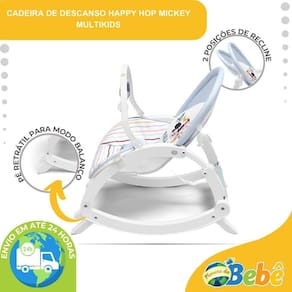 Cadeira de Descanso e Balanço Para Bebê Com Canção de Ninar Mickey - Multikids A Cadeira Happy Hop Mickey da Multikids é a opção ideal para proporcionar ao seu bebê momentos de descanso e diversão. Com um design inovador e funcional, ela é 2 em 1, podendo ser utilizada tanto no modo balanço quanto no modo cadeira de descanso, adaptando-se às necessidades do seu pequeno. Com recursos pensados para o bem-estar do bebê, ela conta com 2 brinquedos interativos que estimulam o desenvolvimento, além de um módulo musical com 10 canções de ninar e 5 sons da natureza. A função de vibração, com duas intensidades, também contribui para o relaxamento do bebê, criando um ambiente mais tranquilo e acolhedor. Seu cinto de segurança de 3 pontos, com protetor entrepernas, garante que o bebê fique sempre bem acomodado e protegido. Já o encosto acolchoado oferece 2 posições de recline, proporcionando ainda mais conforto para o pequeno. Sua estrutura leve e resistente torna o uso mais prático, enquanto os pés retráteis permitem alternar facilmente entre as funções de balanço e descanso. Outro destaque é o seu arco interativo removível e a sua estrutura dobrável, que facilita seu armazenamento e seu transporte, tornando-a perfeita para diferentes ambientes e levando ainda mais diversão para o pequeno em qualquer lugar. Aprovada pelo Inmetro, a Cadeira Happy Hop é ideal para acompanhar o crescimento do seu bebê com conforto e segurança. Principais Características: - Idade Recomendada do Nascimento até 3 Anos - Peso Máximo Suportado: 20kgs - Modelo: Happy Hop Mickey - Possui 10 Canções de Ninar e 5 Sons da Natureza - Central de Controle com 2 Ajustes de Volume - Função Vibração com 2 Intensidades - Estrutura com Fechamento Dobrável Compacto - Encosto com 2 Posições de Recline - Pés Retráteis para Uso na Função Balanço ou Descanso - Cinto de Segurança de 3 Pontos - Possui Protetor Entrepernas - Encosto Confortável Acolchoado - Estrutura Leve e Resistente - Possui 2 Brinquedinhos Interativos - Arco Interativo Removível - Necessário 4 Pilhas AA Não Inclusas - Aprovado pelo Inmetro Especificações Técnicas: - Conteúdo da Embalagem: 1 Cadeira de Descanso Happy Hop Mickey - Multikids - Dimensões do Produto Aberto AxLxP : 45,5 x 49,0 x 61,0cm - Dimensões do Produto Fechado AxLxP : 62,0 x 49,0 x 61,0cm - Composição/Material: Polipropileno, Poliéster e Ferro - Alimentação: 4 Pilhas AA Não Inclusas - Peso: 3,000kgs - : 90 dias Contra Defeitos de Fabricação Pelo Fabricante - Certificação: Inmetro 001678/2022 - Código do Fabricante: BB383 - EAN: 7908842809252 - Marca: Multikids Imagens Meramente Ilustrativas. As cores e estampas podem variar de acordo com o lote do fabricante.
