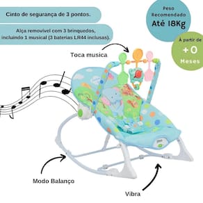 Possui um encosto ajustável e um cinto de segurança de três pontos, garantindo a segurança durante o uso. Os móbiles interativos e a barra de brinquedos removível estimulam a curiosidade e o desenvolvimento motor da criança. Com função musical e vibratória, a cadeira proporciona momentos de relaxamento e diversão.