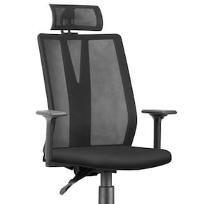 Encosto alto, em tela flexível de dupla frontura com estrutura do quadro injetado em resina termoplástica de excelente desempenho, polipropileno com adição de fibra de vidro.
