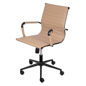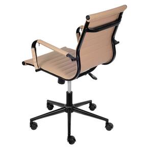 Nossa Cadeira Office Esteirinha Dark Baixa - Caramelo possui um design com linhas horizontais no encosto e no assento, conferindo um visual moderno e, um ótimo conforto devido ao acolchoamento. O revestimento é em PU num tom caramelo, o que a torna versátil para diversos ambientes. Os braços são curvos, também revestidos em PU com detalhes em preto nas conexões com a estrutura.