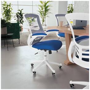 Espuma, Malha, Metal, Plástico, Madeira Compensada Mude a vibe do seu escritório com esta cadeira de escritório com moldura branca combinada com malha azul. Esta cadeira de escritório oferece conforto nas costas de malha ventilada, pressão reduzida nas pernas do assento com contornos e braços articulados elegantes e funcionais Nossa cadeira está em conformidade com o padrão ANSI, BIFMA X5.1 17 A cadeira de tarefas contemporânea oferece conforto superior Costas curvadas ventiladas fornecem suporte lombar e respirabilidade Alavanca de inclinação empurre para travar na posição vertical pullout para ativar o movimento de balanço, enquanto o botão de tensão de inclinação controla a resistência de inclinação Marca: Não Informado