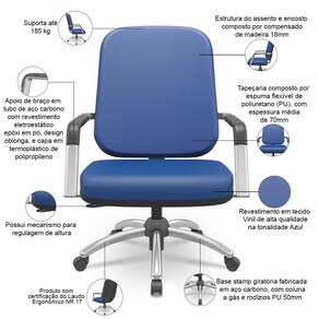 Com rodas: Sim | ProductInstructions: Produto para uso em ambiente interno, nao devendo ficar exposto ao sol, calor e umidade excessivos. | Formato de venda: Unitário | Cor: Azul | Tipo de cadeira de escritório: Cadeira Giratória Operativa Plus Size | Modelo detalhado: Magno Giratória Base Cromada | ColorSimple: Azul | Modelo: Magno | Color: Azul | ColorSupplier: Azul | Com apoio de braços: Sim | ColorFamily: Azul | Model: Magno | Materiais do aro para pés: na | Número de registrocertificação INMETRO: ABNT NBR 13962, NR 17 | Com aro para pés: Não | MaterialFamily: Vinil | Material do estofamento: Vinil | Material: Base Giratória de Aço Carbono, Espuma Flexível Poliuretano, Vinil | Requer montagem: Sim | ProductHeight: 115 cm | OriginCountry: Brasil | ProductContents: 01 Cadeira Giratória, manual de instruções | ProductWarranty: 90 dias após o recebimento do produto | OriginState: PR | SupplierSimpleName: Cadeira de Escritório Giratória com Braço Cromada Magno P03 Vinil Azul - Lyam Decor | ProductWidth: 71 cm | ProductLength: 73 cm | SizeDescription: Altura: 115 cm x Largura: 71 cm x Profundidade: 73 cm | ProductWeight: 25 kg