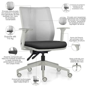 Peso máximo suportado 110 kg, com uso recomendado de 8 horas diária.