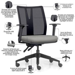 Peso máximo suportado 110 kg, com uso recomendado de 8 horas diária.